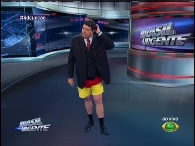 | Datena cumpriu a promessa e apareceu vestindo cueca no "Brasil Urgente" desta quinta. O apresentador havia concordado em apresentar o programa de cueca caso o Brasil perdesse o jogo contra a Alemanha Reprodução |