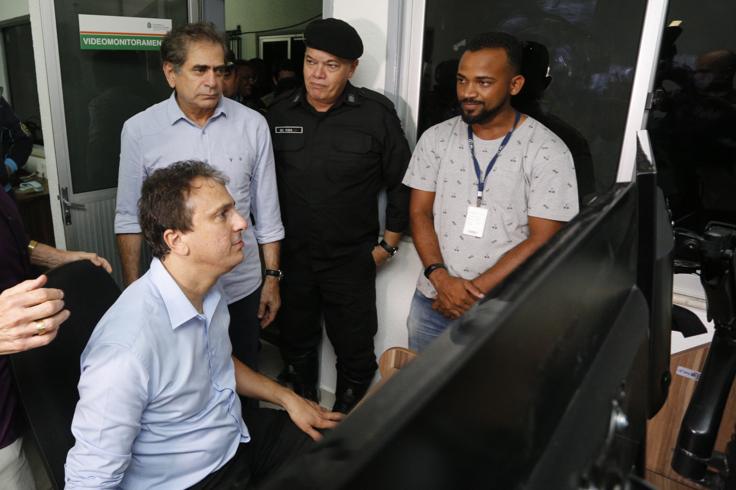 A central de videomonitoramento fica na sede de Companhia de Policiamento da cidade. O governador Camilo Santana visitou a sede da companhia para acompanhar de perto o sistema de videomonitoramento e também o Batalhão do Raio.